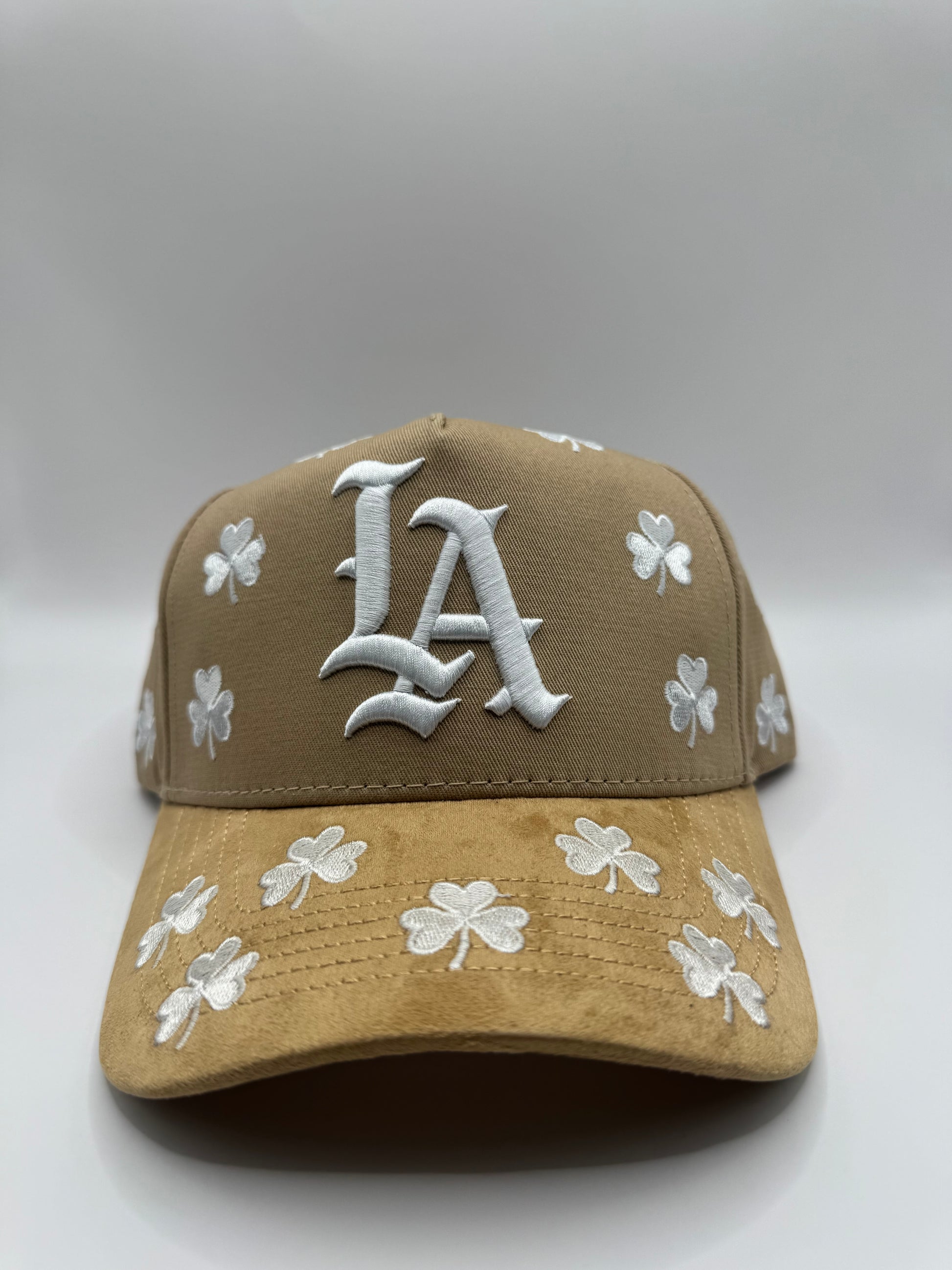 Crafted in a warm beige tone with a white embroidered LA logo and three-leaf clovers across the crown and brim, this hat blends luck, culture, and luxury in one iconic piece.